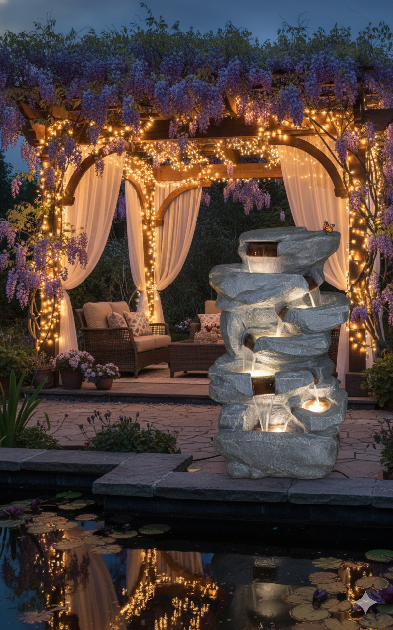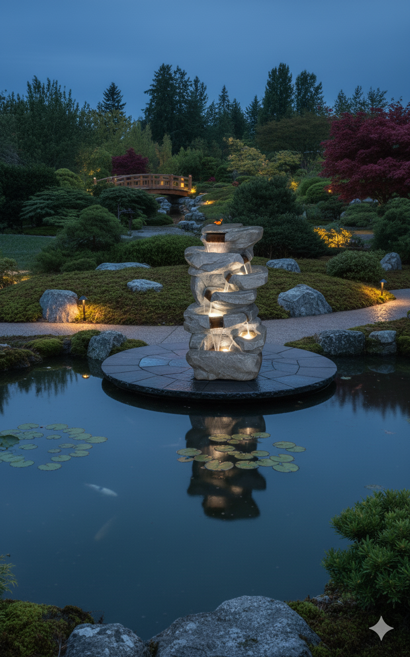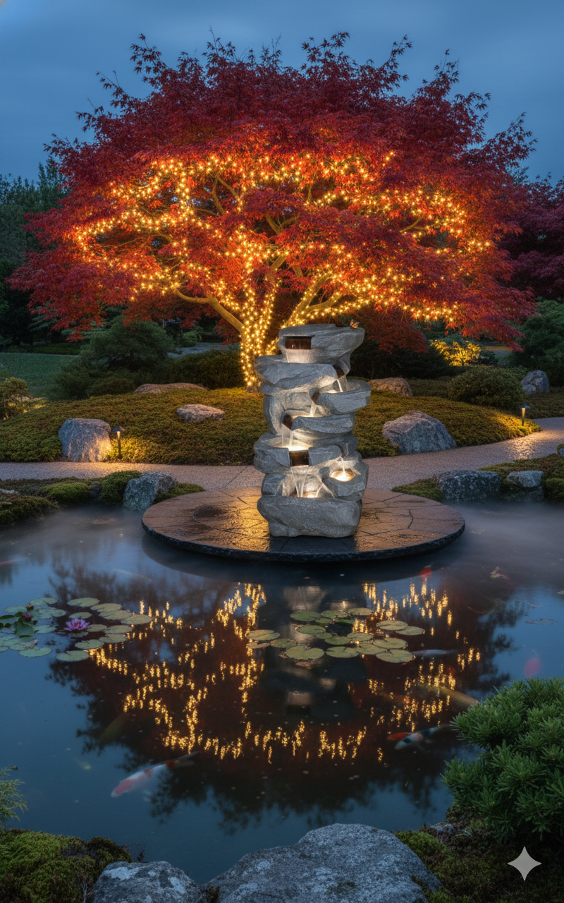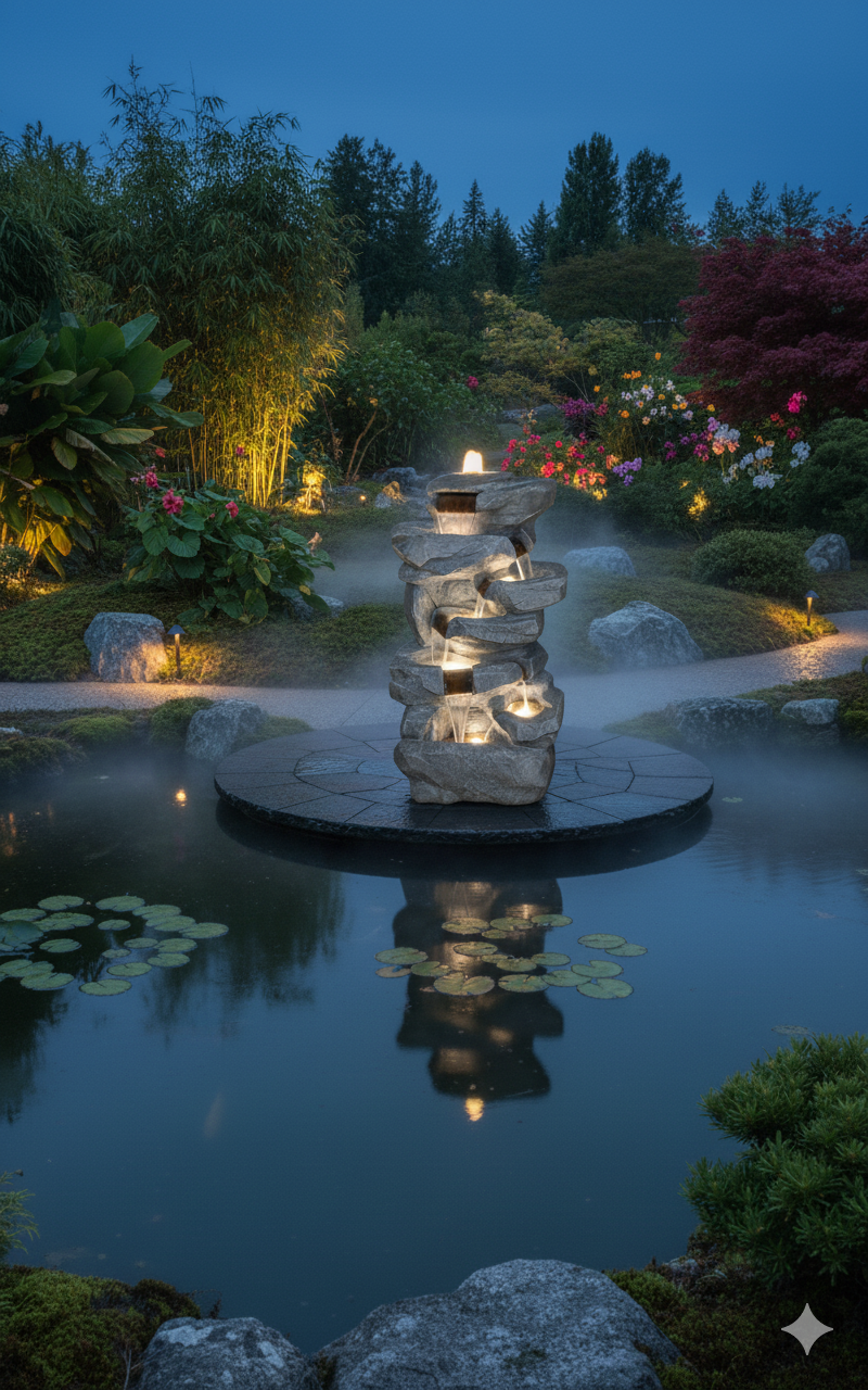 • Illumination: Integrated warm LED lighting is strategically placed at the base of several spillways, brilliantly highlighting the movement of the water and creating a beautiful nighttime glow.