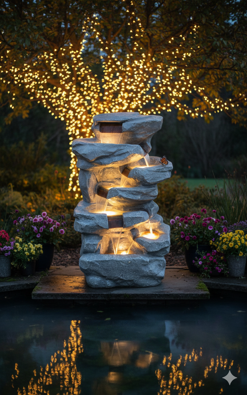 • Design: Features a multi-tiered, vertical stack of rugged, grey, granite-like rocks. Water flows down four or five distinctive ledges, often enhanced by internal copper-toned spillways, creating multiple mini-waterfalls.